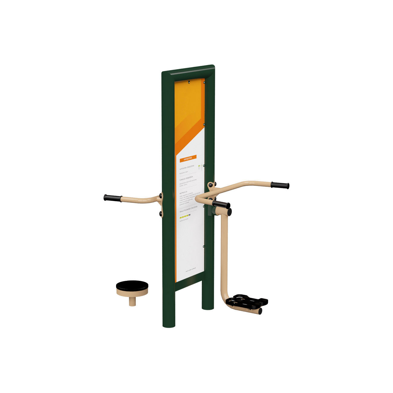 Instructions: Stand on the rotating platform. Hold the handrails with both hands. While holding the handrails, rotate the lower part of your body alternately to the left and right. During the exercise, try not to move the upper part of your body.
